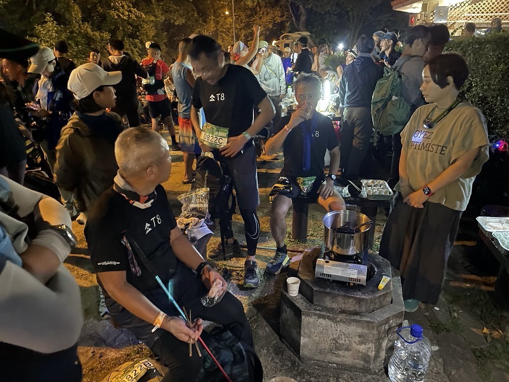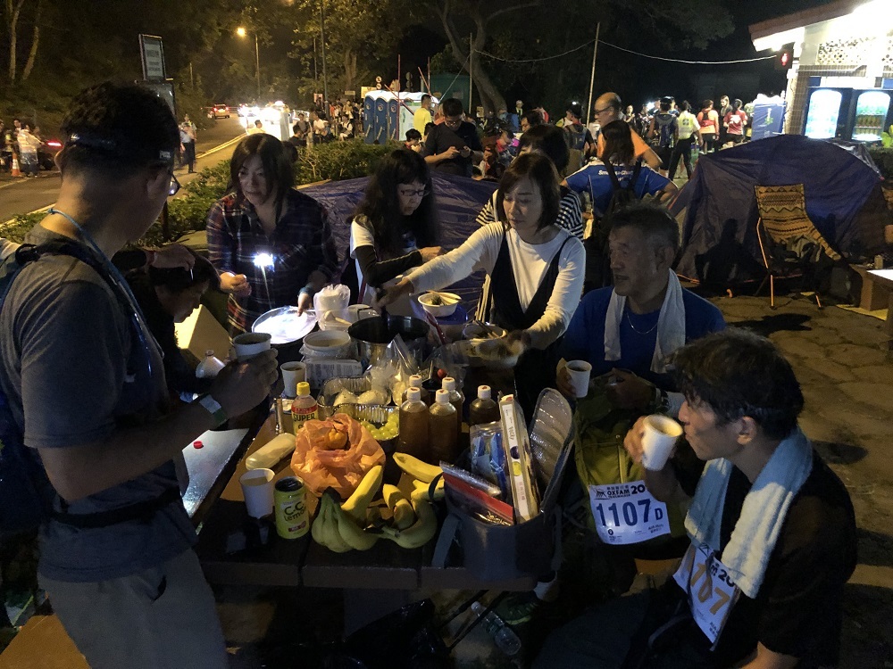 前回と違いスタートが昼過ぎだったことで、Sec.3に入り程なくして日が落ちました。昼間は日差しがあって暖かさもありましたが、この日は風が強く日暮れ後の鶏公山では一気に寒さが襲ってきました。そんな中でCP3のサポート隊によるにゅう麺は心が安らぎました。フルーツと定番コーラも心に染み渡りました。