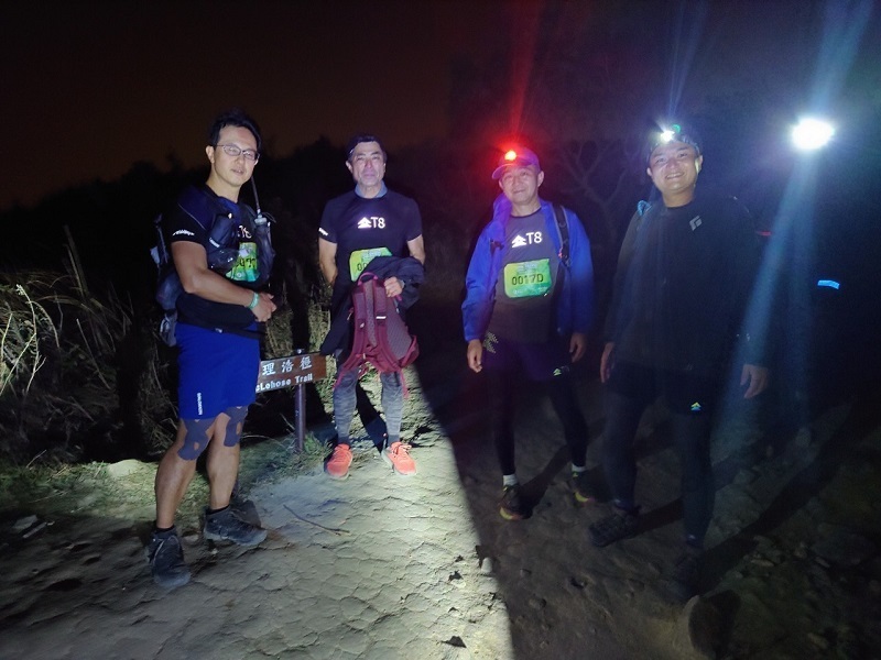 CP1の休憩は5分ほどで、日が落ち始めた鹹田灣の砂浜を歩く。大浪坳を越えて赤徑に至るが、前回取ったトイレ休憩は省き、CP2の北潭凹へ。CP2では皆食欲があってバナナを戴く。ここまで前回及び計画よりも30分早いペースだった。上地さんは1週間断酒して、身体が軽いそうだ。