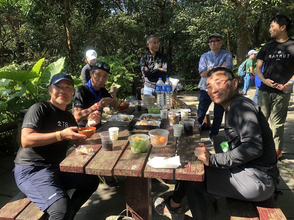 CP8では、サポート隊の大接待を戴きました。恒例のカレーうどんは川島さんも加わって準備いただいたようで、頭が下がります。森田屋のお稲荷さんがまた、甘めの味付けで美味しいこと!ご飯が少なめの上品お稲荷さんを堪能し、カレーうどんもしっかりおかわりをいただきました。CP8からはサポート隊の一部も伴走に加わってラストスパートです。とはいえ、栄養補給も必要ですから、途中のベンチでピクニックしました。