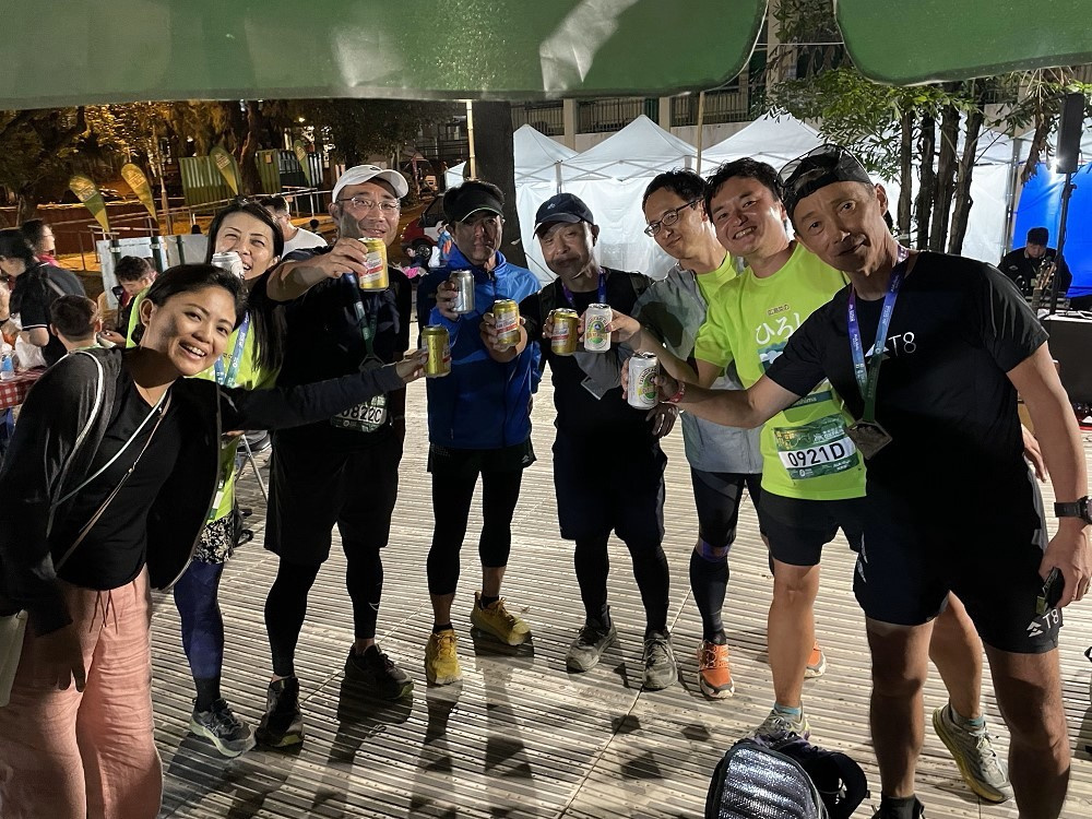 会場から佐敦の街市に移動し、サポート隊の皆さん共にレース直後の祝杯を挙げた。当初の想定タイム(34時間)であれば開催は無理だったが、ゴールが早かったこともあり実現した。(30時間のゴールであれば、当日も絶対に祝杯を挙げに行けると確信していたので自身の中では想定内であった)冷たいビールとローカル中華で完歩を喜んだ。