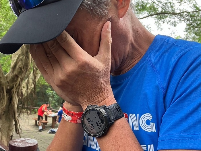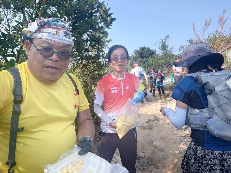 笑顔でスタート。快調に歩を進め、東壩には1時間45分ぐらいで着く。ペースは約10分/kmで、前回の10分30秒/kmより早い。マクリSec.2に入り浪茄灣に下りた後、最初の難所である西灣山を登る。個人的には前回より柔らかい靴を選択していて心配だったが、テーピング効果で足首がしっかり固定されて安堵した※2。山頂周辺ではボランティアがカットレモンを振舞ってくれていた。手袋をしての配布だったので、素手だった前回より衛生的だ。すっぱいクエン酸で疲労回復しつつ、西灣山頂では休憩は取らずにCP1の西灣まで進んだ。CP1ではコーラが見えてときめいたが、商店の売り物で、エイドは水しかなかった。