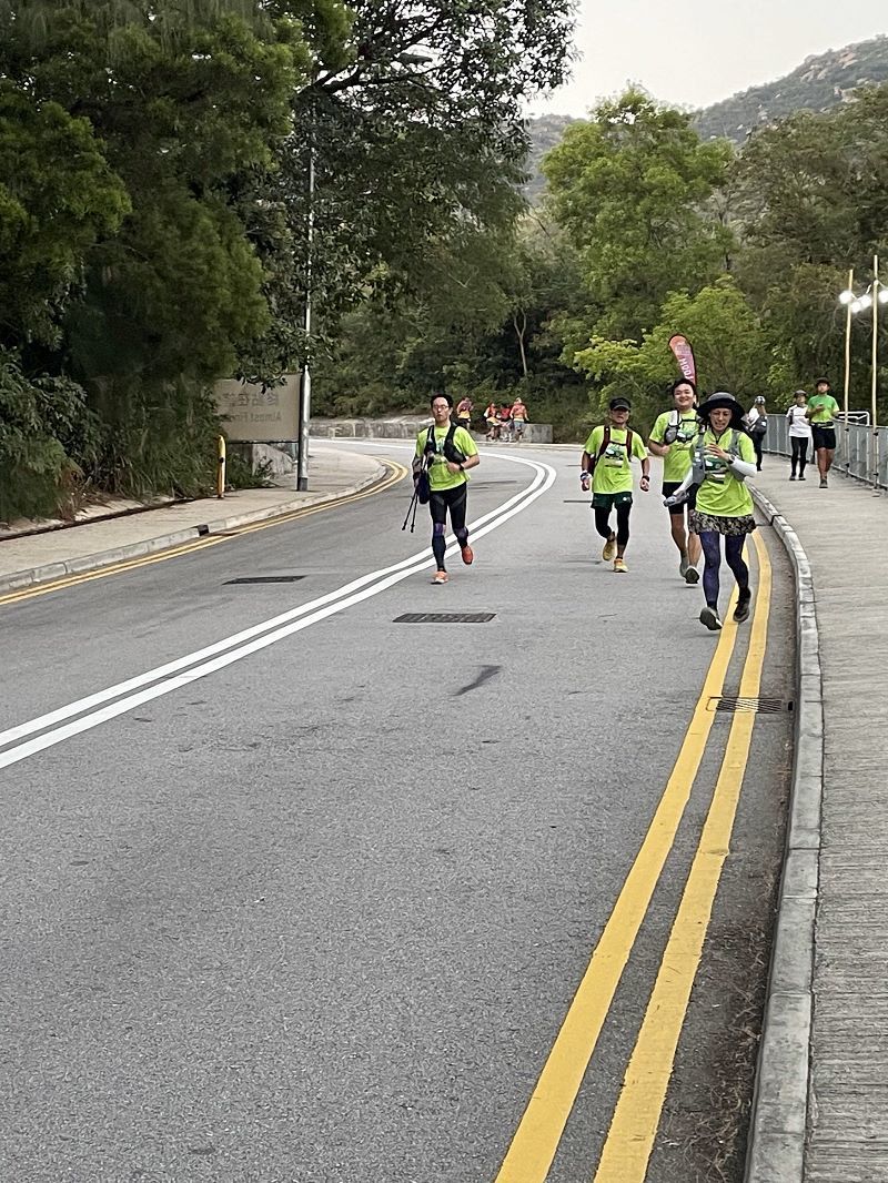 今回のゴールは屯門の国際十字路会付近で、とても狭いけど分かりやすい場所でした。深圳からお越しの吉野さんと合流し待機していると、野中チームから「ゴールまで5kmを切りました」との連絡が入ったのでお迎えに参上。予想時間よりだいぶ早いとは思いましたが、なんと4人が走ってくるではありませんか!前回置いて行かれた悪夢が蘇りますが、教訓を活かし遠くまでお迎えに行かなかったのでゴール撮影は(ギリギリ)できました。危なかったです。