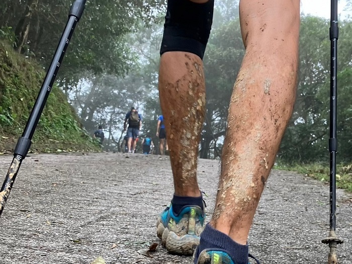 相変わらず小雨交じりのなか、西湾山の上りに差し掛かると、1,000人以上が歩いたトレイルは既にドロドロにぬかるんでいました。靴底に泥がネチョネチョくっついて、グリップは全くありません。注意して慎重に進みました。